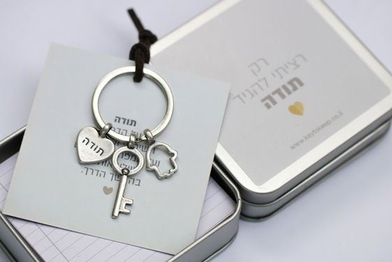 מתנה מלאת הערכה וכוונה. המפתח מתחבר ישר למחזיק מפתחות ומזכיר למי שקיבלה אותו שמעריכים אותה, הקופסה עם הפיתקיות מאוד שימושית ומשמחת. הכל מגיע באריזת מתנה חגיגית.